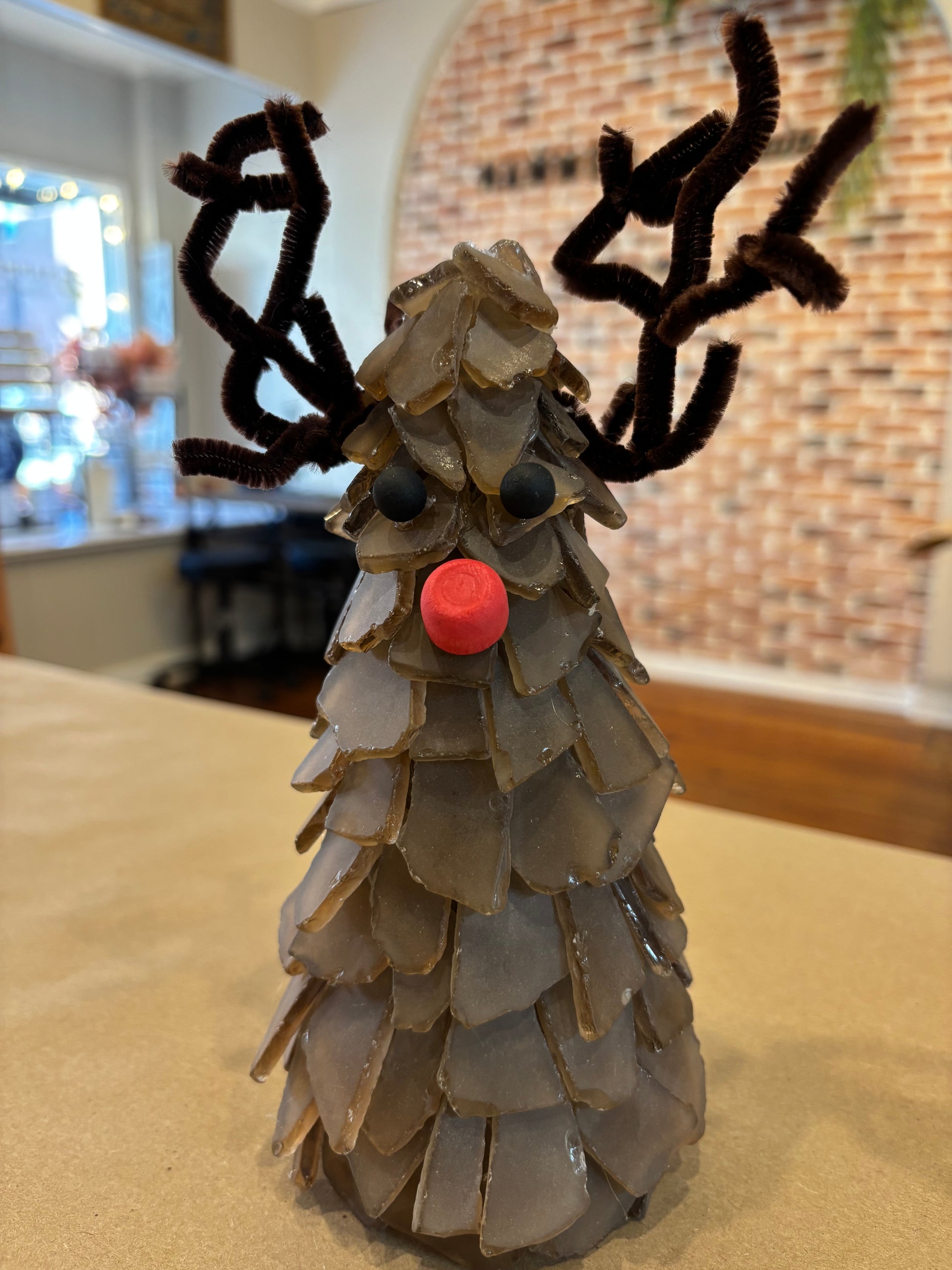 We will help guide you through the process from start to finish. All supplies are included to make your Reindeer with sea glass! Battery powered string lights come with your project. These unique Reindeers are 7" tall plus the antlers!